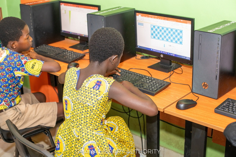 This student is one of a new generation of computer whizzes growing up in Volta Region, thanks to in-depth digital learning workshops offered by Volta Regional Library. Through these workshops learners acquire skills ranging from the most basic - manipulating the mouse and using the keyboard - to understanding and using more complex applications for creating and editing text, presentations and spreadsheets, communications, coding and design, including Microsoft Word, Excel, PowerPoint, Canva, Wix, Python, Scratch and others.