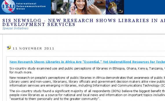 Read now: Click (itu.int/ITU-D/sis/newslog/2011/11/11/NewResearchShowsLibrariesInAfricaAreEssentialYetUnderutilizedResourcesForTechnologyAndCommunityDevelopmentServices.aspx">here to read the article as published by ITU News, or view an online archive copy