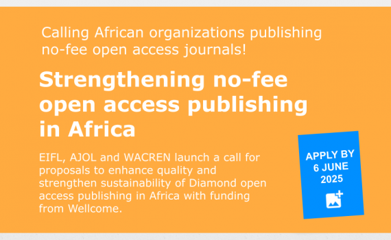CALL CLOSED: EIFL, AJOL (African Journals Online) and WACREN (the West and Central African Research and Education Network) invite African organizations - legal entities that own open access (OA) journals that do not charge any fees for either authors or readers (often referred to as Diamond OA journals), and where editorial teams are based - to participate in this call for proposals.